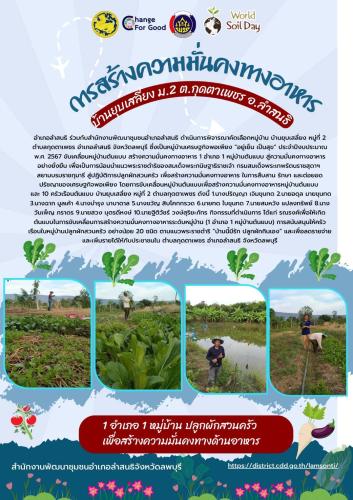 อำเภอลำสนธิ ร่วมกับสำนักงานพัฒนาชุมชนอำเภอลำสนธิ ดำเนินการพิจารณาคัดเลือกหมู่บ้าน บ้านยุบเสลี่ยง หมู่ที่ 2 ตำบลกุดตาเพชร อำเภอลำสนธิ จังหวัดลพบุรี ซึ่งเป็นหมู่บ้านเศรษฐกิจพอเพียง “อยู่เย็น เป็นสุข” ประจำปีงบประมาณ พ.ศ. 2567 ขับเคลื่อนหมู่บ้านต้นแบบ สร้างความมั่นคงทางอาหาร 1 อำเภอ 1 หมู่บ้านต้นแบบ สู่ความมั่นคงทางอาหารอย่างยั่งยืน เพื่อเป็นการน้อมนำแนวพระราชดำริของสมเด็จพระกนิษฐาธิราชเจ้า กรมสมเด็จพระเทพรัตนราชสุดาฯ สยามบรมราชกุมารี สู่ปฏิบัติการปลูกผักสวนครัว เพื่อสร้างความมั่นคงทางอาหาร ในการสืบสาน รักษา และต่อยอดปรัชญาของเศรษฐกิจพอเพียง โดยการขับเคลื่อนหมู่บ้านต้นแบบเพื่อสร้างความมั่นคงทางอาหารหมู่บ้านต้นแบบและ 10 ครัวเรือนต้นแบบ บ้านยุบเสลี่ยง หมู่ที่ 2 ตำบลกุดตาเพชร ดังนี้ 1.นางปริญญา เจิมขุนทด 2.นายอดุล มายขุนทด 3.นางฉาก มูลเค้า 4.นางบำรุง นาบาดาล 5.นางขวัญ สิบโคกกรวด 6.นายทด ใบขุนทด 7.นายสมหวัง แปลงทรัพย์ 8.นางวันเพ็ญ ภราดร 9.นายสวง บุตรดีหงษ์ 10.นายฐิติวัชร์ วงษ์สุริยะภัทร กิจกรรมที่ดำเนินการ ได้แก่ รณรงค์เพื่อให้เกิดต้นแบบในการขับเคลื่อนการสร้างความมั่นคงทางอาหารระดับหมู่บ้าน (1 อำเภอ 1 หมู่บ้านต้นแบบ) การสนับสนุนให้ครัวเรือนในหมู่บ้านปลูกผักสวนครัว อย่างน้อย 20 ชนิด ตามแนวพระราชดำริ “บ้านนี้มีรัก ปลูกผักกินเอง” และเพื่อลดรายจ่ายให้กับประชาชนในตำบลกุดตาเพชร อำเภอลำสนธิ จังหวัดลพบุรี