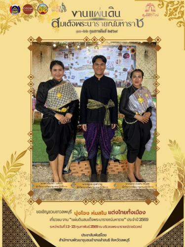 สำนักงานพัฒนาชุมชนอำเภอลำสนธิ เชิญชวนทุกท่าน"นุ่งโจง ห่มสไบ แต่งไทยทั้งเมือง" เพื่อต้อนรับนักท่องเที่ยวในงานแผ่นดินสมเด็จพระนารายณ์มหาราช ครั้งที่ ๓๘ ประจำปี ๒๕๖๙ (๑๓ - ๒๒ ก.พ. ๖๙) อุดหนุนผ้าไทย กระตุ้นเศรษฐกิจชุมชน ร่วมกันแสดงออกถึงเอกลักษณ์อันงดงามของเมืองละโว้ธานี